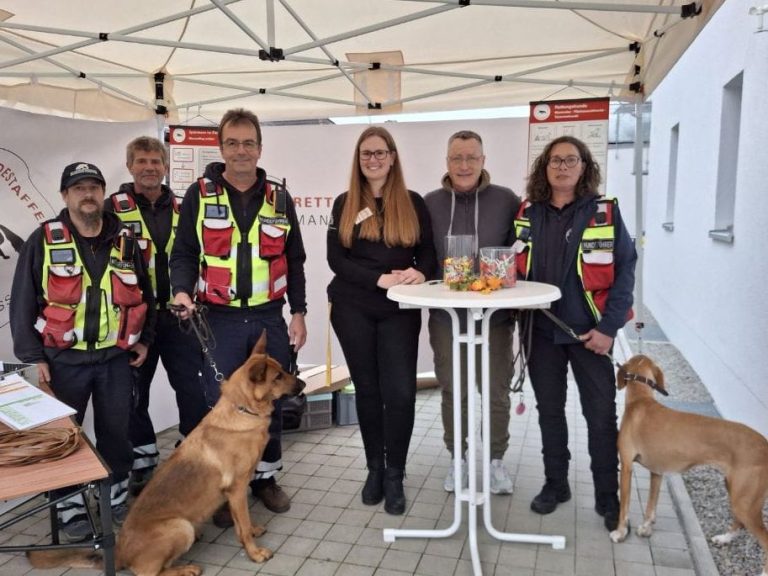 An unserem Stand beantworteten wir zahlreiche Fragen interessierter Besucherinnen und Besucher und führten kurze Demonstrationen durch, in denen unsere Hunde zeigten, wie sie eine versteckte Person aufspüren.